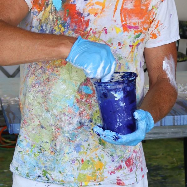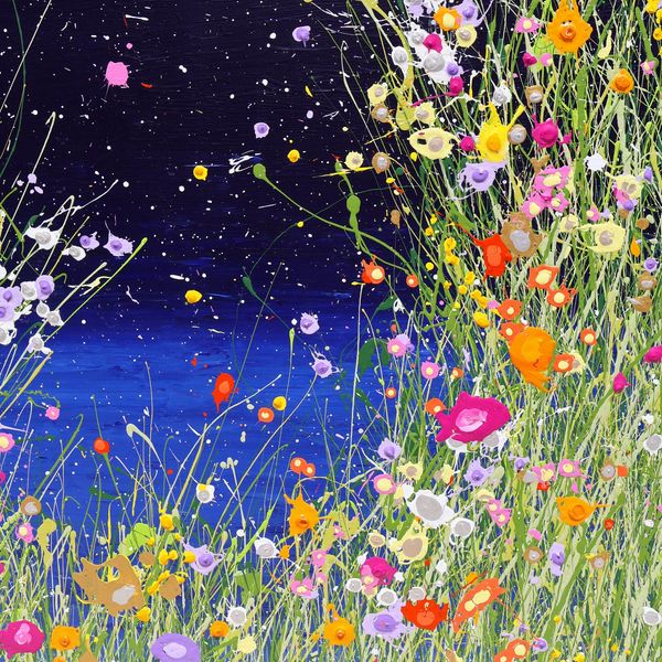 Each painting is constructed of many layers, and often I do not know what the final outcome will be. As the rich pigments dry, they open up to reveal the radiance and beauty of nature. My creative process is both methodical and carefree—I splash and fling paint while perfectly placing a flower, stem, or star. It’s a full-body, emotional experience using brushes, bottles, rags, and even my fingers. The outcome is radiant and cheerful, with color as vibrant and intense as life itself, meant to reflect the excitement I feel for this amazing world.